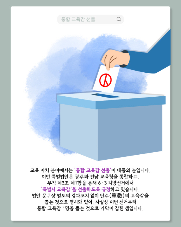또 다른 쟁점은 통합 교육감 선출이다. 특별법안은 광주·전남 교육청을 통합하고, 오는 6·3 지방선거에서 ‘특별시 교육감’을 선출하도록 규정하고있다. 별도의 경과조치 없이 단수 교육감을 뽑는 것으로 명시돼 있어 사실상 이번 선거부터 통합 교육감 1명을 선출하는 방향으로 가닥이 잡혔다.