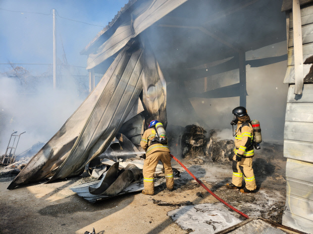 또 창고에서 시작된 불이 인근 농산물 선별분리작업장으로 옮겨 붙어 총 2개 동이 완전히 불탔다.