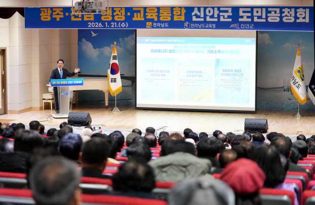 ![]() 김영록 전남지사가 21일 신안군청에서 열린 광주·전남 행정통합 도민공청회에서 행정통합 추진 방안을 설명하고 있다. <전남도제공> |