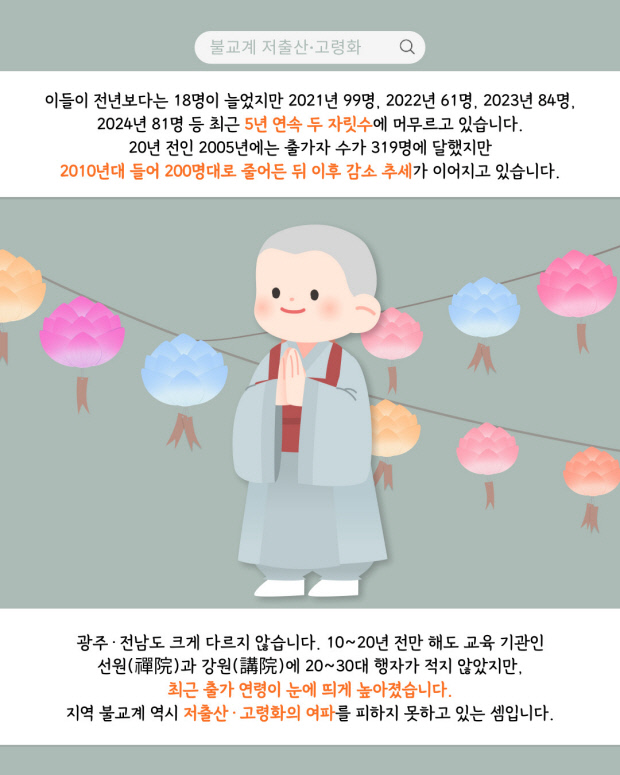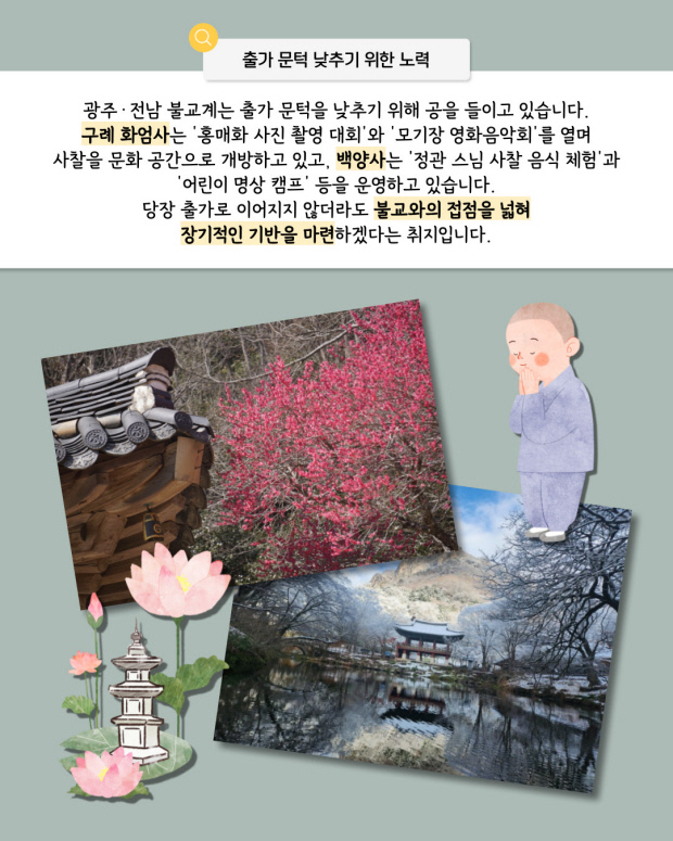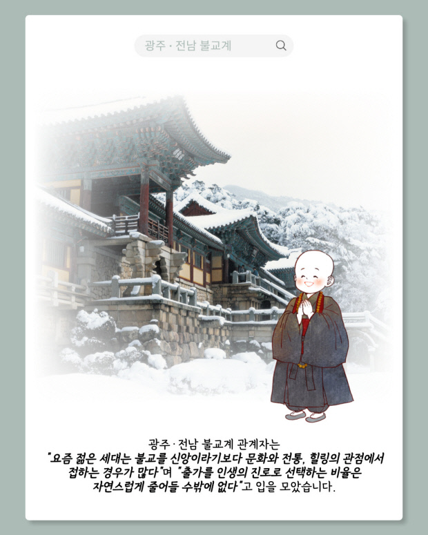 명상·템플스테이 등으로 불교가 젊은 세대에게 문화·힐링 코드로 자리 잡고 있다. 하지만 출가자는 줄어 지난해 조계종 출가자는 99명에 그쳤다. 광주·전남도 출가 연령이 높아져 40~50대가 대부분이다.