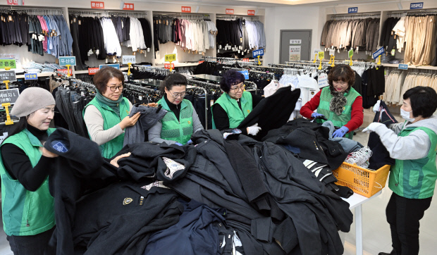 지난 23일 광주 북구 우산동 새마을회 상설 교복나눔장터에서 새마을회 회원들이 다음달 5일 본격적인 교복 판매를 앞두고 동행정복지센터와 관내 중고등 학교로부터 기증 받은 교복을 정리하고 있다.