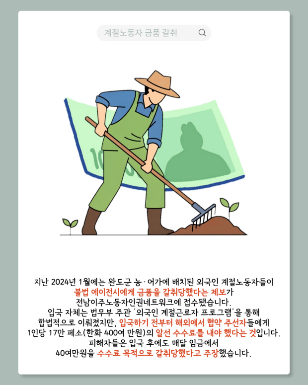 정부와 지자체가 올해 전남 2만1000여 명, 전국 10만여 명의 외국인 계절근로자를 배정했지만, 불법 브로커 문제는 여전히 심각하다.