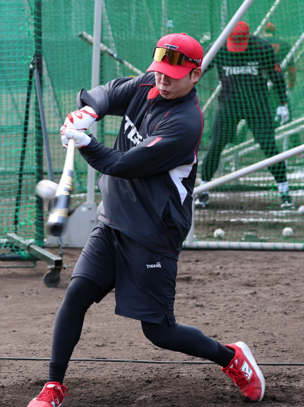 아쉬웠던 지난 시즌을 뒤로하고 KIA 박정우가 1번을 달고 새 출발한다. 일본 아마미 캠프에서 타격 훈련을 하는 박정우. <KIA 타이거즈 제공>