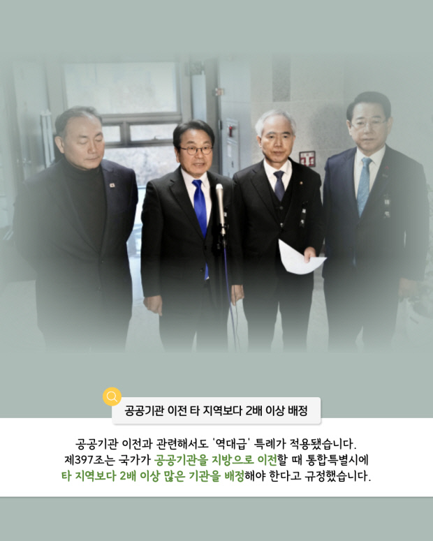 수정안은 법안 제395조에 중앙행정기관 이전을 의무화하고, 농협중앙회 본부 이전도 명시했다. 또 공공기관 지방 이전 시 통합특별시에 타 지역의 2배 이상 배정하도록 규정했다.
