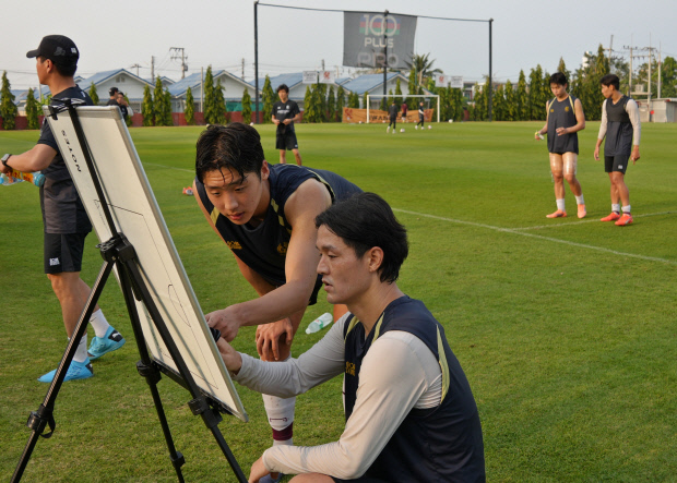 ![]() 광주FC의 장신 수비수 곽성훈이 태국 후아힌 캠프에서 이정규 감독(왼쪽)과 대화를 나누고 있다. |