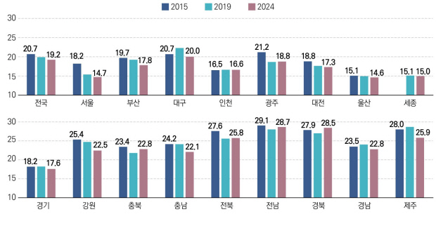 ![]() ■지역별 경제활동인구 대비 자영업자 비율<단위:%·자료:국회미래연구원> |