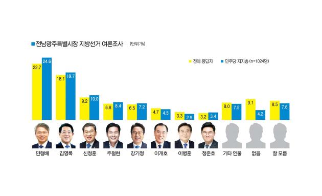 민주당 지지층(1024명)만을 대상으로 한 조사에서도 전체 결과와 유사한 흐름이 이어졌다. 민주당 지지자 중 24.6%가 민형배 의원을 선택했고 김영록 지사는 19.7%를 기록했다.