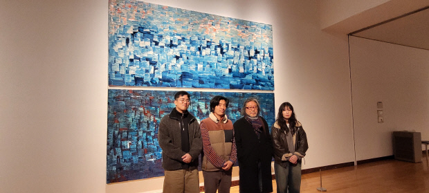 시립미술관은 오는 4월 12일까지 ‘한희원과 젊은 영혼들의 만남’전을 펼친다. 한 작가의 그림 ‘생의 파문’ 앞에서 포즈를 취한 노여운 작가, 박성완 작가, 한희원 작가, 손지원 작가. (왼쪽부터)