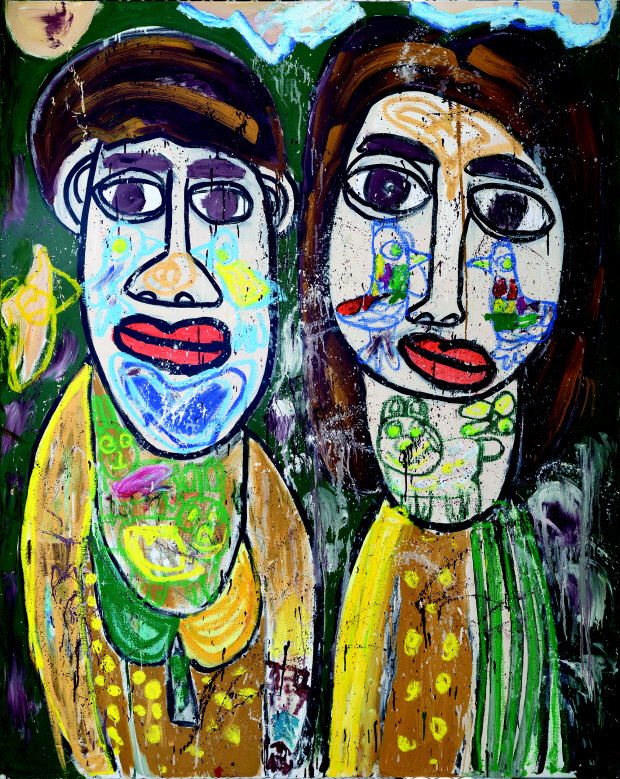 ‘Lovers’는 나란히 선 연인들의 모습을 초점화한 작품이다. 몸집에 비해 큰 얼굴과 커다란 이목구비는 편안하면서도 따스한 인상이다. 남자와 여자의 얼굴에는 오똑 솟은 코를 중심으로 두 마리의 새가 다정한 눈길을 건넨다. 사랑하는 두 연인의 마음을 새에 은유해 표현했는데 전체적인 몸짓이나 동작도 천진난만하다.