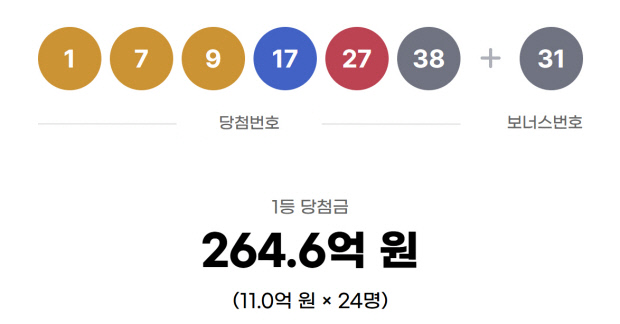 7일 진행된 제1210회 로또복권 추첨에서 ‘1, 7, 9, 17, 27, 38’이 1등 당첨번호가 됐다.