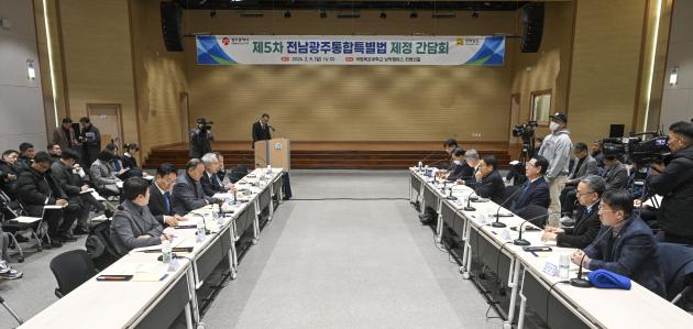 광주시와 전남도는 8일 목포대 남악캠퍼스에서 ‘전남광주통합특별시 설치 특별법안’ 논의를 위한 제5차 시도지사-지역 국회의원 간담회를 열었다.