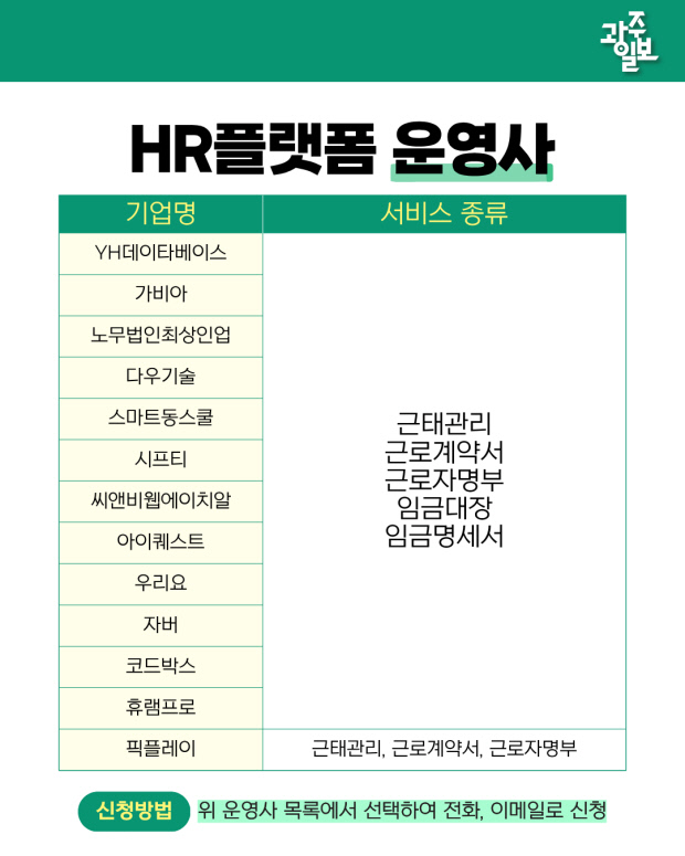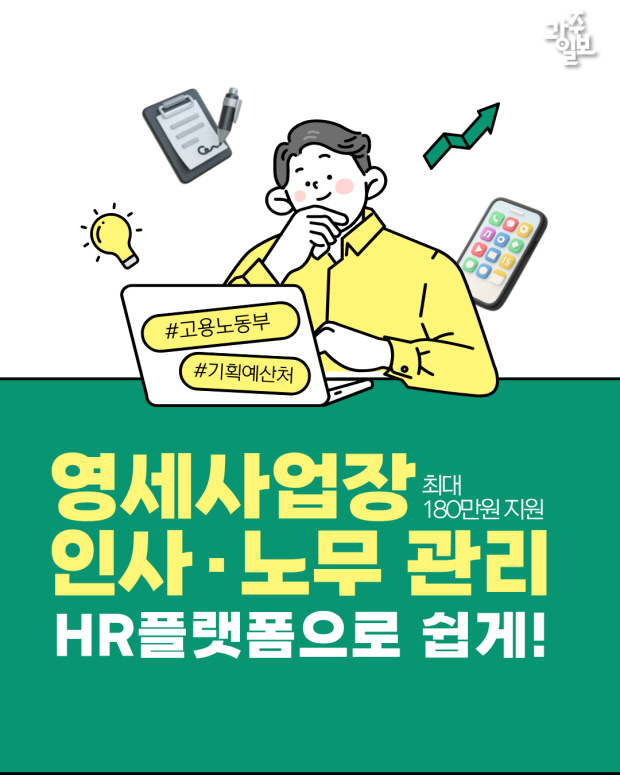 고용노동부가 선정한 13개 인사 관리(HR) 플랫폼에 전화 또는 이메일로 신청하면 최대 180만원(월 18만원)상당의 서비스를 지원받을 수 있다.