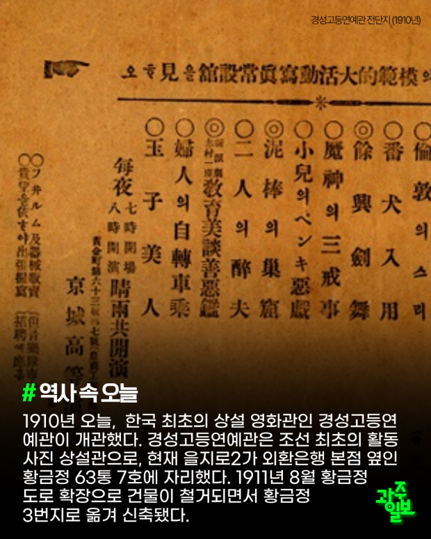 1910년 오늘, 한국 최초의 상설 영화관인 경성고등연예관이 개관했다. 경성고등연예관은 조선 최초의 활동사진 상설관으로, 현재 을지로2가 외환은행 본점 옆인 황금정 63통 7호에 자리했다. 1911년 8월 황금정 도로 확장으로 건물이 철거되면서 황금정 3번지로 옮겨 신축됐다.