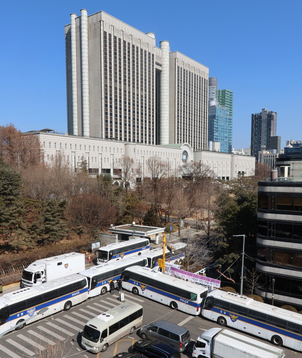 ![]() 12·3 비상계엄과 관련한 윤석열 전 대통령의 내란 우두머리 혐의 사건 1심 선고를 앞둔 18일 서울시 서초구 서울중앙지법 주변에 경찰 버스가 주차돼 있다. /연합뉴스 |