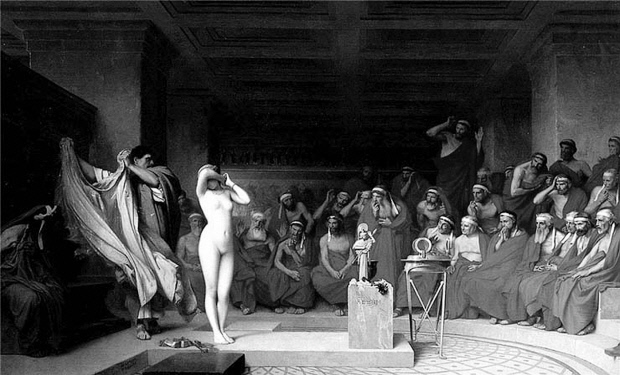 ![]() 프랑스 화가 장 레옹 제롬이 그린 ‘법정에 선 프리네’. 1861년 작품으로 “이렇게 아름다우니 제발 용서해달라”는 세상에서 가장 짧은 변론 한마디로 그리스 최고 법정에서 무죄 판결을 받은 미녀 프리네의 모습을 담고 있다. |