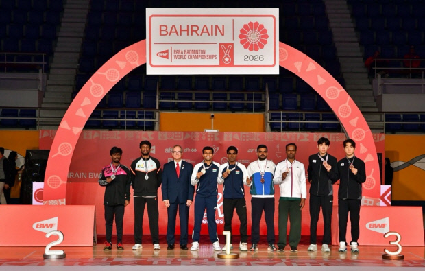 ![]() 2026 바레인 장애인배드민턴 세계선수권대회 SL3-SL4 남자 복식에서 동메달을 딴 이승후(오른쪽에서 두 번째)가 조나단 등과 기념촬영을 하고 있다. <광주시장애인체육회 제공> |