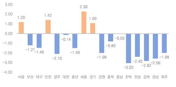 ![]() ■2024년 기준 청년 여성(20~34세) 시도별 순이동률 <단위:%·자료:한국여성정책연구원> |