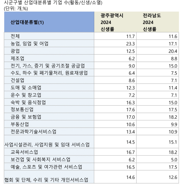 광주·전남에서 신생률이 가장 높은 산업은 각각 농림어업(23.3%)과 광업(20.4%)인 것으로 나타났다.