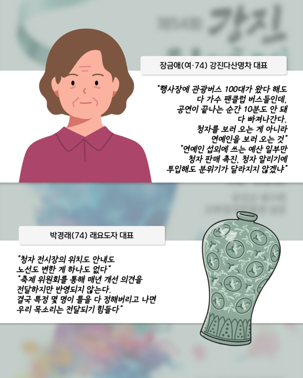 청자 장인들은 “축제 주인공은 연예인과 팬클럽”이라며, 공연 위주 홍보와 부스 안내 부족으로 축제 취지가 퇴색됐다고 지적했다. 일부 초청 가수 논란까지 겹치며 ‘화제성에만 치중한다’는 목소리도 나온다.
