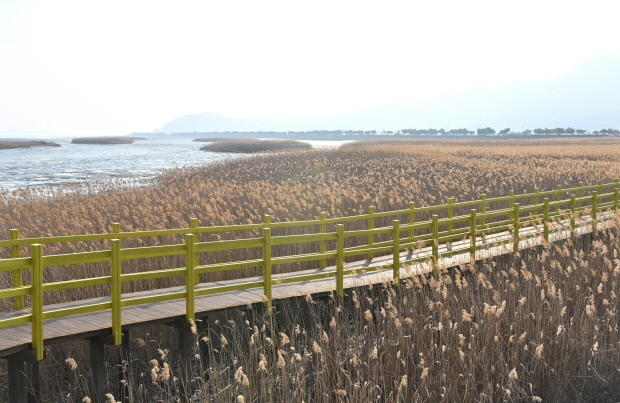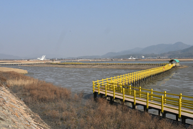 강진만 생태공원 데크길, 멀리 큰고니 조형물이 보인다.