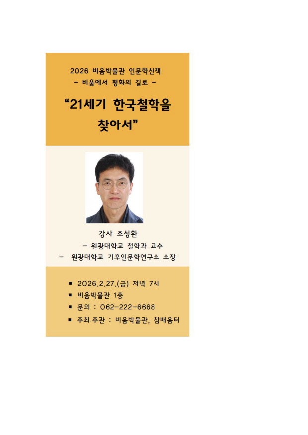 2월 강연(27일 오후 7시)은 조성환 원광대 철학과 교수가 강사로 나서 시민들과 이야기를 나눈다. ‘21세기 한국 철학을 찾아서’를 주제로 조 교수는 오늘날 한국 철학의 의미를 비롯해 K문화의 사상과 근원, 우리 문화에 내재하는 깊은 사상적 배경 등에 대해 나눌 예정이다.