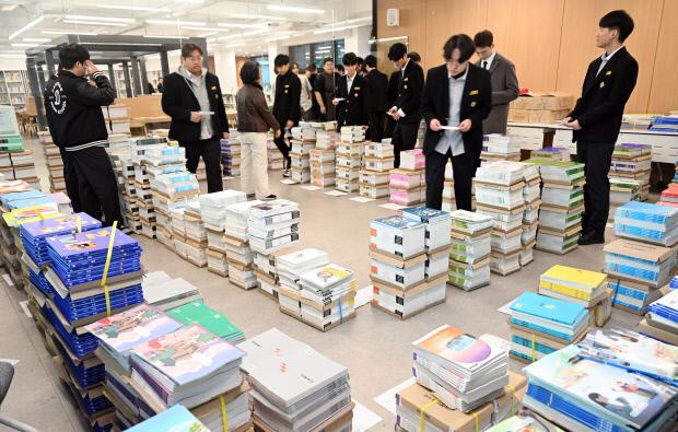 신학기를 앞둔 24일 광주시 서구 광주대동고 3학년 학생들이 새 학기 교과서를 배부받고 있다. /나명주 기자 mjna@kwangju.co.kr