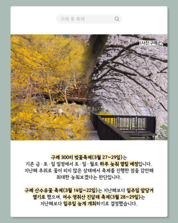 이에 광양시, 구례군, 여수시, 신안군 등은 개화 시기를 예측하며 축제 일정을 늦추거나 조정 중이다.