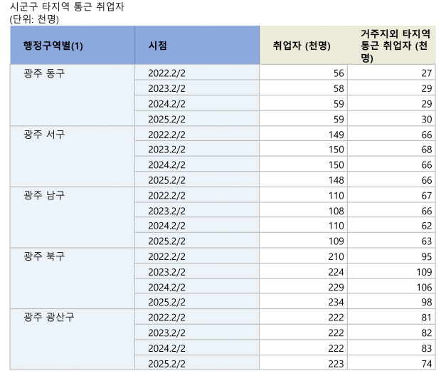 광주에서는 동구와 서구가 3년 전보다 타지역 통근 취업자 비율이 각각 2.6%포인트, 0.3%포인트 증가했다. 북구와 광산구, 남구는 각각 3.3%포인트, 3.3%포인트, 3.1%포인트 줄었다.