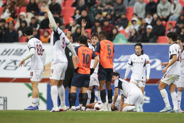 1일 제주월드컵경기장에서 열린 광주FC와 제주SK FC의 개막전에서 광주 최경록의 정강이를 밟은 제주 이탈로가 레드카드를 받고 있다. <한국프로축구연맹 제공>