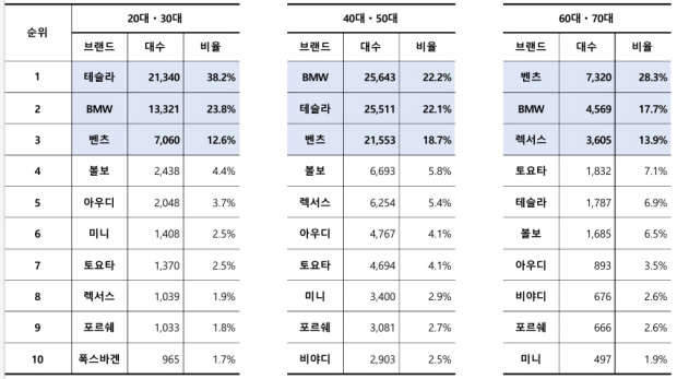 2030 테슬라, 4050 BMW, 6070은 ‘전통’ 벤츠 강세