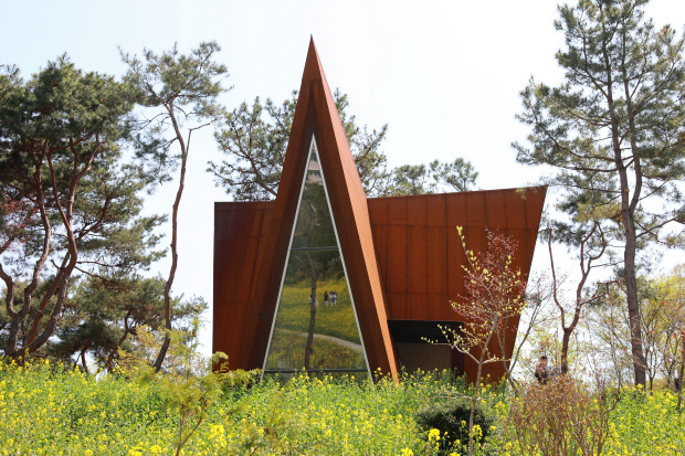 전주대학교 교정의 가장 조용한 언덕을 오르면, 시선이 멈추는 지점이 있다. 나무들 사이에서 녹슨 주홍빛의 조형이 뾰족하게 솟아 있는데, 이것이 김준영 전주대 건축학과 교수가 설계한 작은 예배당 ‘숲속 초막 셋’이다. 건물의 모습은 마치 숲이 스스로 마련해둔 제단처럼 보인다. 이 건축은 존재를 숨기지 않으면서도, 스스로를 과장하지 않는다. ‘숲속 초막 셋’은 김준영 교수가 화려함 대신 침묵을 선택해 만든, 아주 작은 규모의 기도 같은 공간이다.