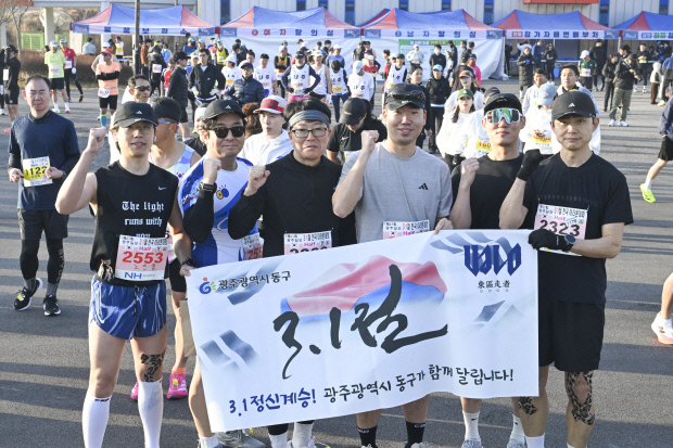 ![]() 1일 화순군 청풍면 화순파크골프장 일원에서 열린 ‘제61회 광주일보 3·1절 전국마라톤대회’에 참가한 광주 동구청 직원들이 출발 전 의지를 다지고 있다.