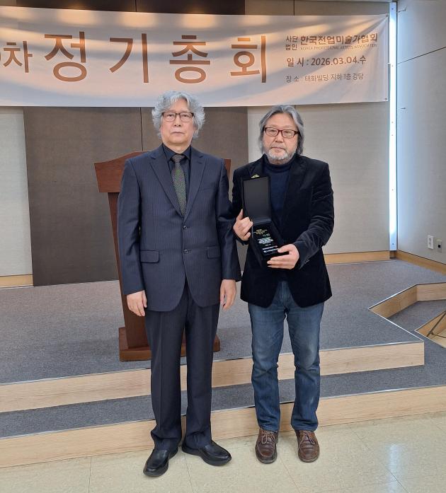 ![]() ‘골든아티스트어워드 올해의 작가상 대상’ 수상자로 선정된 한희원 화가(오른쪽) <한국전업미술가협회 제공> |