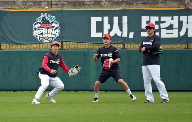 ![]() 오키나와 캠프에 새로 합류한 KIA 외야수 이창진(왼쪽부터)이 4일 박정우, 나성범과 수비 훈련을 하고 있다. |
