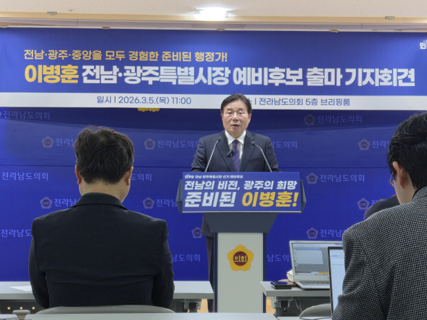 이 수석부위원장은 5일 오전 전남도의회 전남광주특별시장 예비후보 출마 브리핑룸에서 기자회견을 갖고 “지역이 변화를 체감하는 통합을 반드시 실현하겠다”고 밝혔다.
