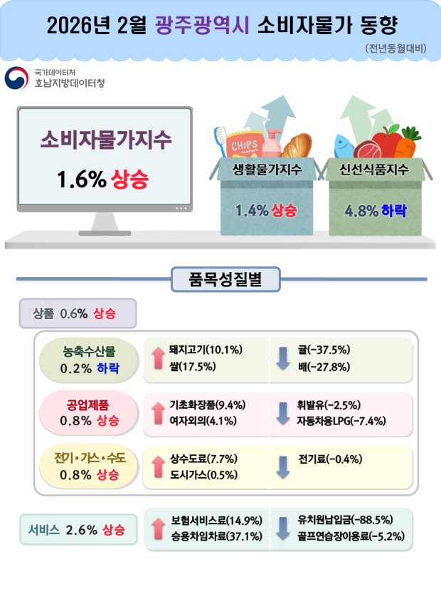 8일 국가데이터처 호남지방데이터청이 발표한 ‘2026년 2월 광주·전남 소비자물가동향’에 따르면 지난달 광주 소비자물가지수는 118.37로 전년 동월(116.45) 대비 1.6% 올랐다.