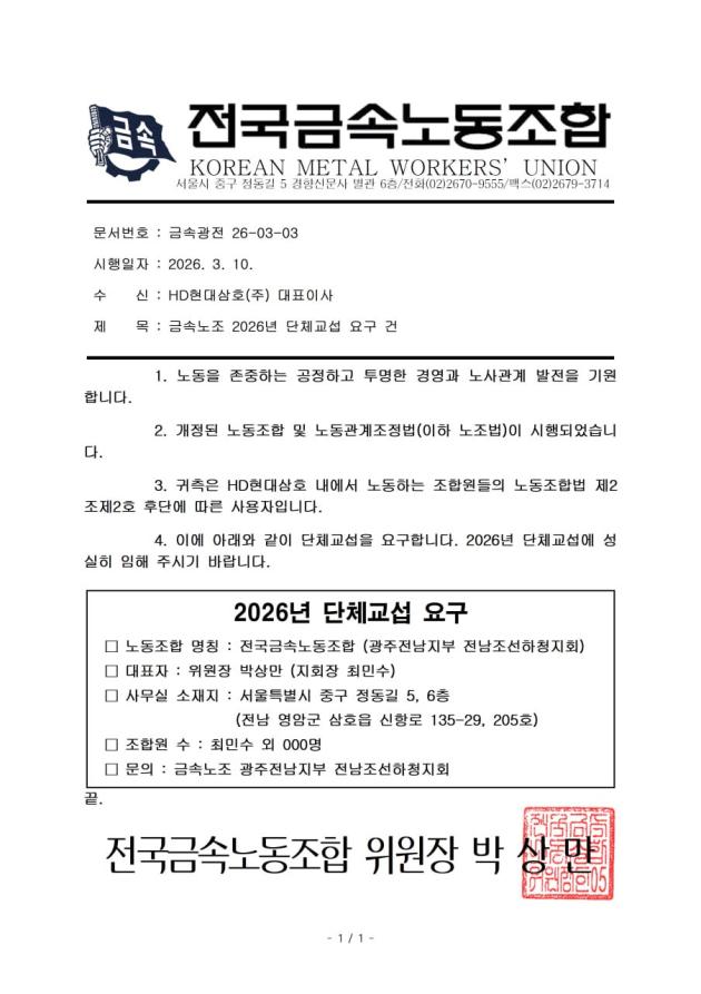 전국금속노동조합 광주전남지부 전남조선하청지회가 10일 HD현대삼호 측에 발송한 단체교섭 공문.<전국금속노동조합 제공>