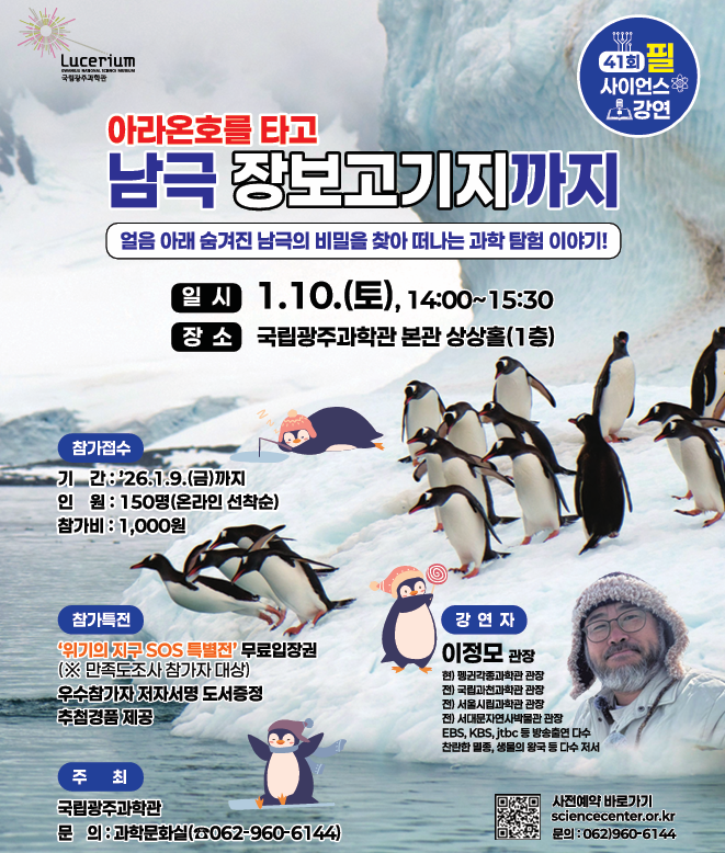 가장 먼저 눈길을 끄는 행사는 오는 10일 오후 2시 과학관 본관 상상홀에서 열리는 ‘제41회 필사이언스 강연’이다. 이번 강연은 ‘아라온호를 타고 남극 장보고기지까지’라는 주제로 진행되며 이정모 펭귄각종과학관장이 강사로 나선다.