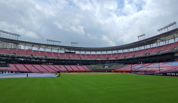 예보보다 일찍 비가 그치면서 챔피언스필드 정비 작업이 진행됐습니다. 비가 더 이상 내리지 않는다면 오후 6시 30분 예정대로 경기가 시작될 전망입니다.
