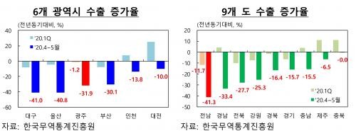 전남 뒤로 코로나19 확산이 심각했던 대구(-41%), 울산(-40.8%)이 수출 부진이 심했고 경남(-33.4%), 광주(-31.9%), 부산(-30.1%), 전북(-27.7%), 강원(-25.3%), 경북(-16.4%), 경기(-15.7%), 충남(-15.5%), 인천(-13.8%), 인천(-13.8%), 대전(-10%), 제주(-6.5%), 충북(0%) 등 순으로 나타났다.