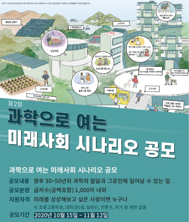 과학의 발달로 일어날 수 있는 기술을 상상하고 이로 인한 경제·사회 분야의 변화된 모습과 사회 문제, 정책적 제안 등을 1000자 내외(띄어쓰기 포함) 시나리오로 담아, 응모하면 된다.