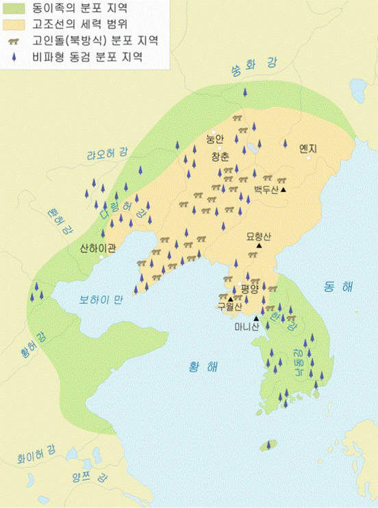 ![]() 동이족의 분포 지역과 고조선의 세력 범위 (2006년 고등학교 교과서) |
