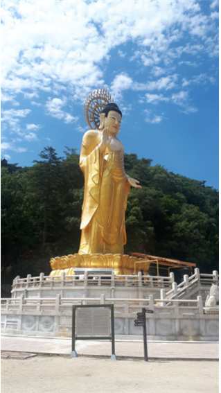 팔상전을 보다 말고 또 한번 놀란다. 왼쪽에 솟아오르듯 서 있는 불상이 이편을 압도한다. 장엄한 불상은 규모를 가늠하기 어렵다. 통일호국 금동미륵불상은 8m의 기단 위에서, 인자한 눈으로 중생을 바라본다. 경내에 있는 모든 유물보다 도드라져 보인다.