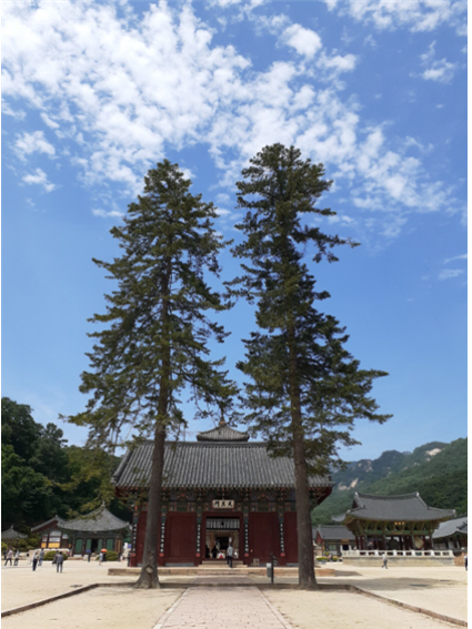 금강문을 지나자 저편에 천왕문이 보인다. 커다란 전나무 두 그루가 길손을 맞는다. 정밀하면서도 이색적인 풍경이다. 삼각형의 외형이 수문장처럼 버티고 선 모습은 경이롭다. 오랜 세월 모진 삭풍을 견뎠을 전나무에선 현자의 기품이 느껴진다.