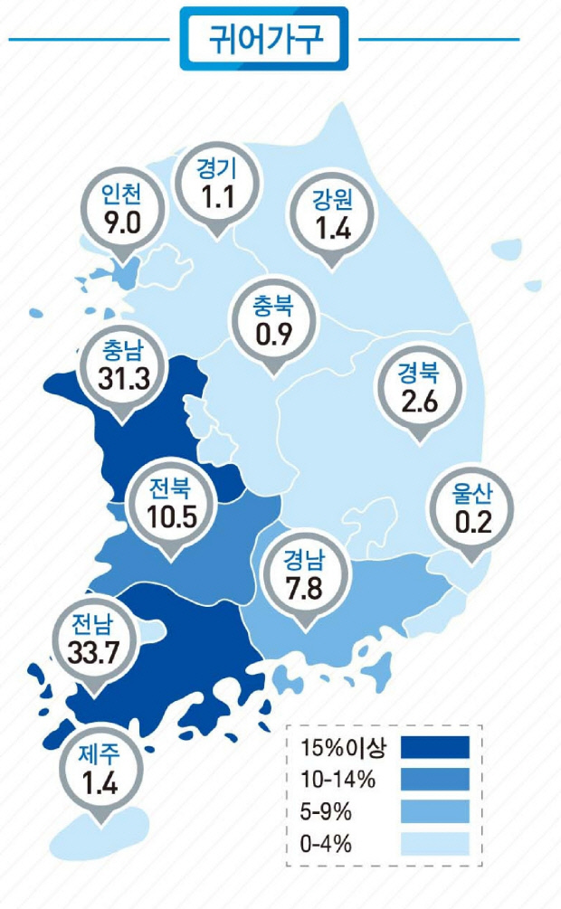 전남 귀어 302가구 가운데 72.8%에 달하는 220가구는 단일가구, 나머지 82가구는 여러 가구가 모인 혼합가구 형태를 보였다.