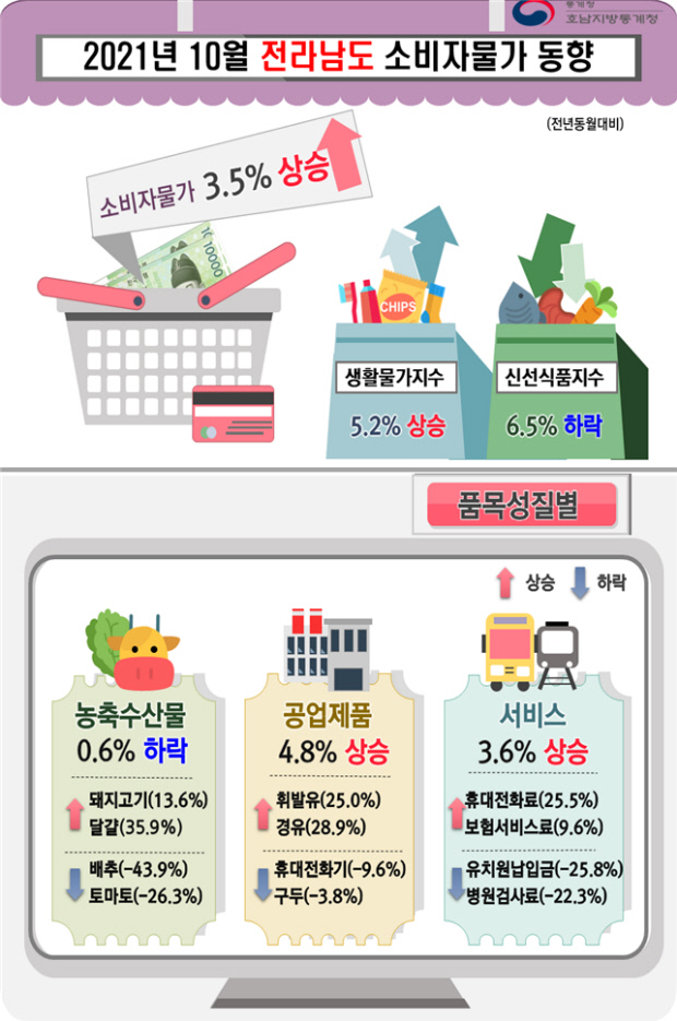 2일 호남지방통계청이 발표한 ‘10월 소비자물가 동향’에 따르면 지난달 광주·전남 소비자물가지수는 지난해 같은 달보다 3.5% 상승했다. 이는 지난 2012년 1월(광주 3.3%·전남 3.4%) 이후 9년 9개월 만에 가장 높은 수준이다.
