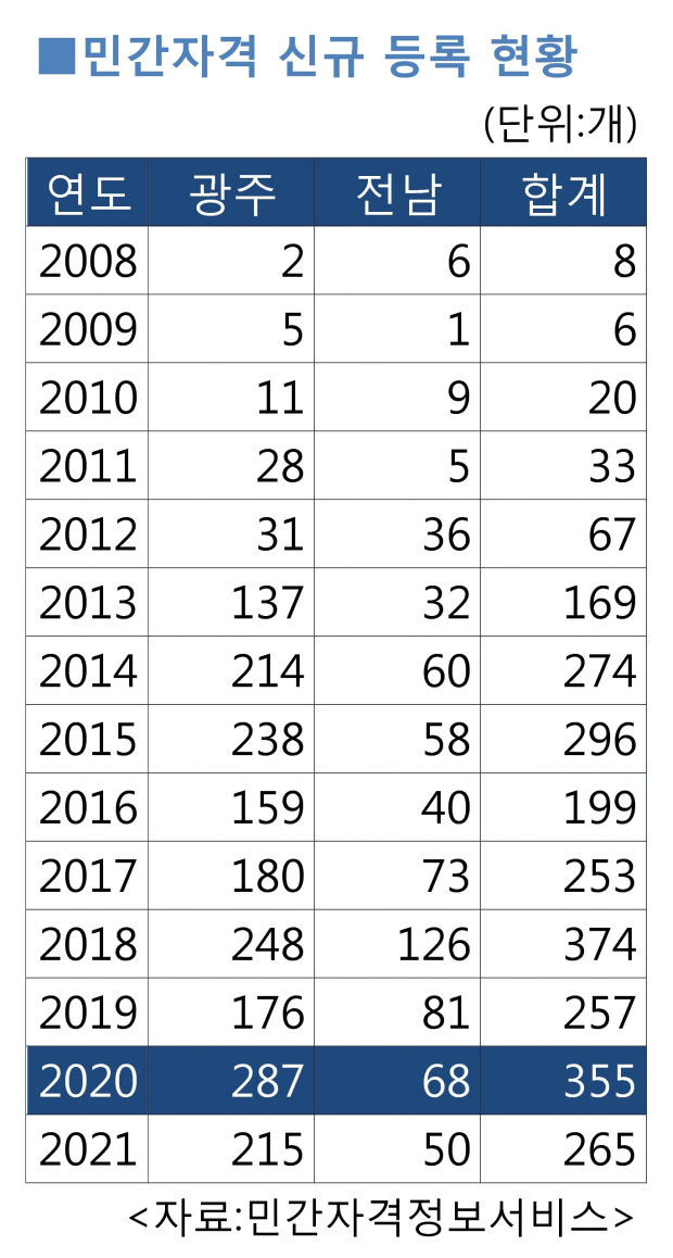 올해도 11월 말 기준 광주 215개·전남 50개 등 265개 자격이 신규 등록했다.