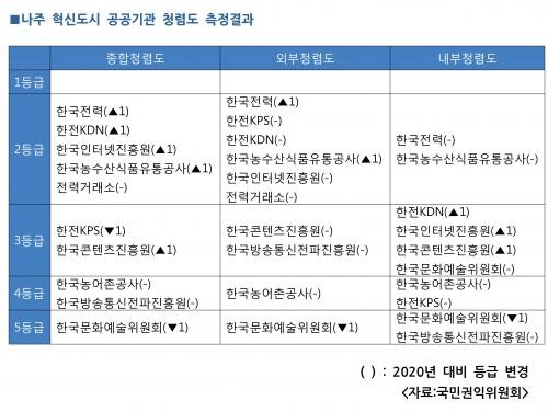 지난해에 비해 청렴도 등급이 오른 나주 빛가람혁신도시 기관은 한국전력과 한전KDN, 한국인터넷진흥원, 한국농수산식품유통공사 등 5곳으로 나타났다.