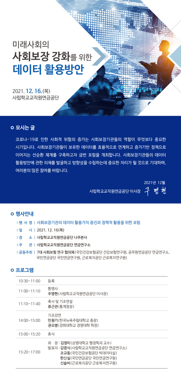 이후 사학연금을 포함한 4대 사회보험기관에서 각 기관의 빅데이터 활용 사례를 중심으로 사회적 위험에 대한 기관 간 공동대응 방안의 모색과 관련한 주제 발표와 토론이 이뤄진다.