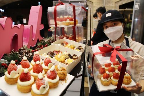 ![]() ㈜광주신세계 지하 1층 식품관 매장 직원이 귀여운 딸기 산타로 꾸민 ‘허니미니도넛’을 선보이고 있다.<광주신세계 제공> |